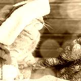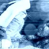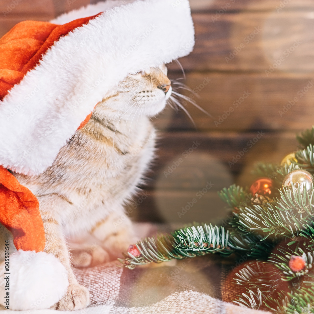 Cute ginger cat in Santa Claus hat sitting near Christmas tree.