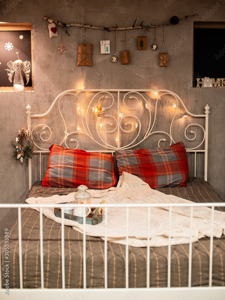 Christmas bedroom decoration in loft style, concrete gray and stick with gifts hanging on the wall.