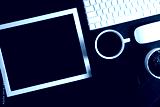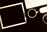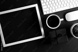 White picture frame with keyboard mouse coffee cup, gift box and Christmas tree decoration on black background. Online Shopping concept and black Friday composition.