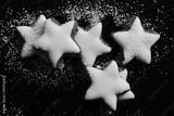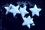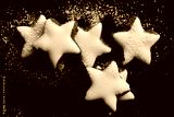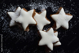 Fresh biscuits in the form of stars with white frosting and powdered sugar against dark background