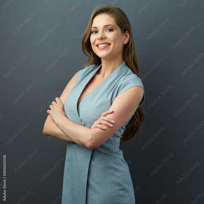 Smiling woman in gray long dress standing with crossed arms.