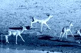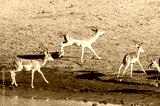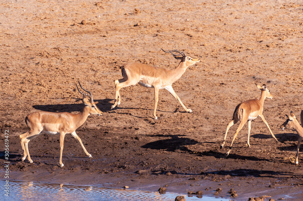 A group of Impalas -Aepyceros melampus- running nervously around a waterhole in Etosha National Park, Namibia.