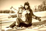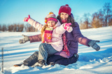 Little girl and her mother playing outdoors at sunny winter day. Active winter holydays concept.