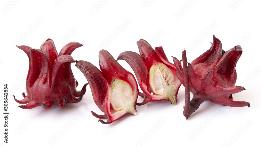 Roselle, Hibiscus sabdariffa red fruit flower on a white background.