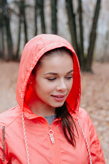Portrait of a healthy woman looking away and standing in autumn park after running.