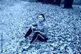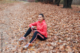Portrait of happy woman with water bottle sitting on autumn leaves in the park