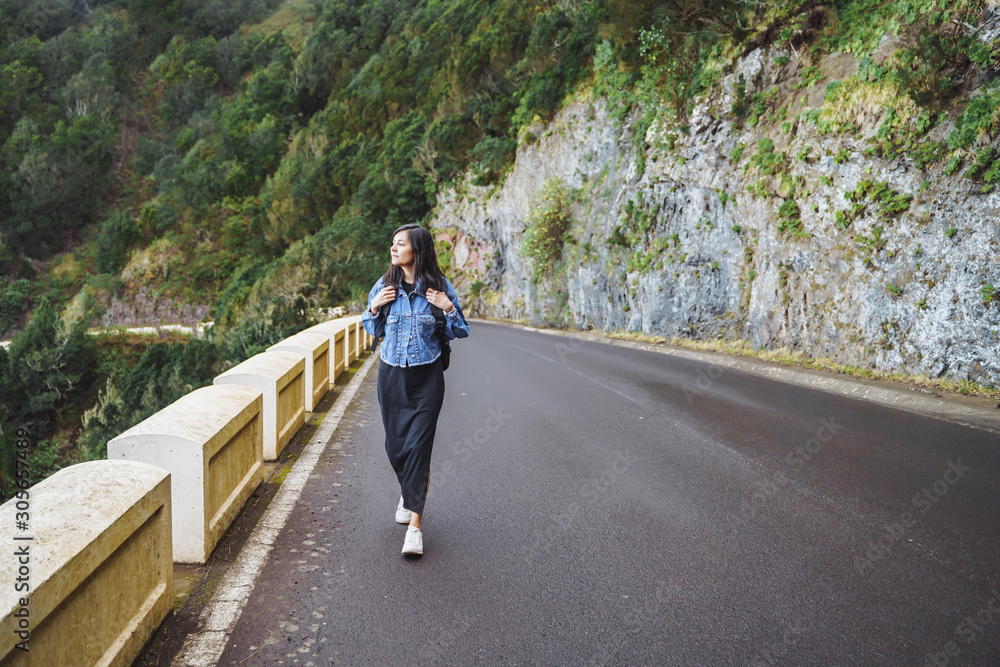 Traveler woman with backpack enjoying and walking on the road in the mountains.