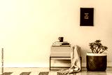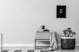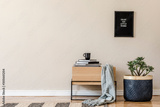 Scandinavian and design home interior of living room with design wooden commode, rattan basket with plants and elegant accessories. Stylish home decor. Template. Mock up frame. Copy space.