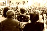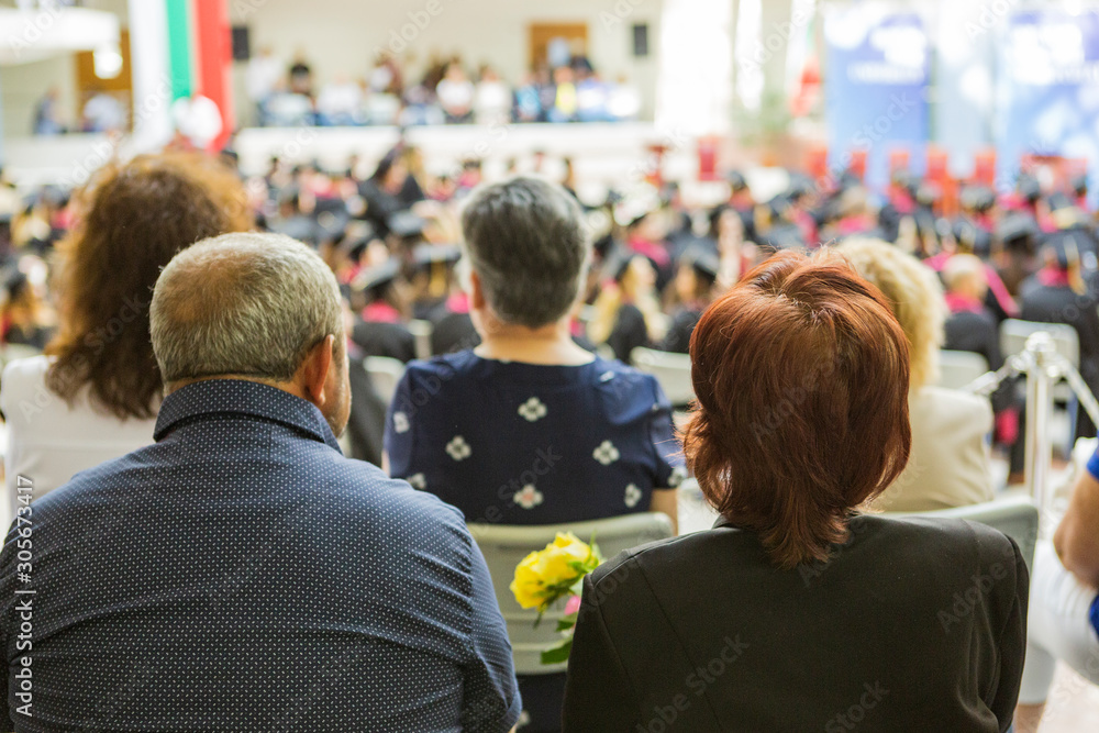 an audience of friends and family at university. the audience watches a celebration in a hall.