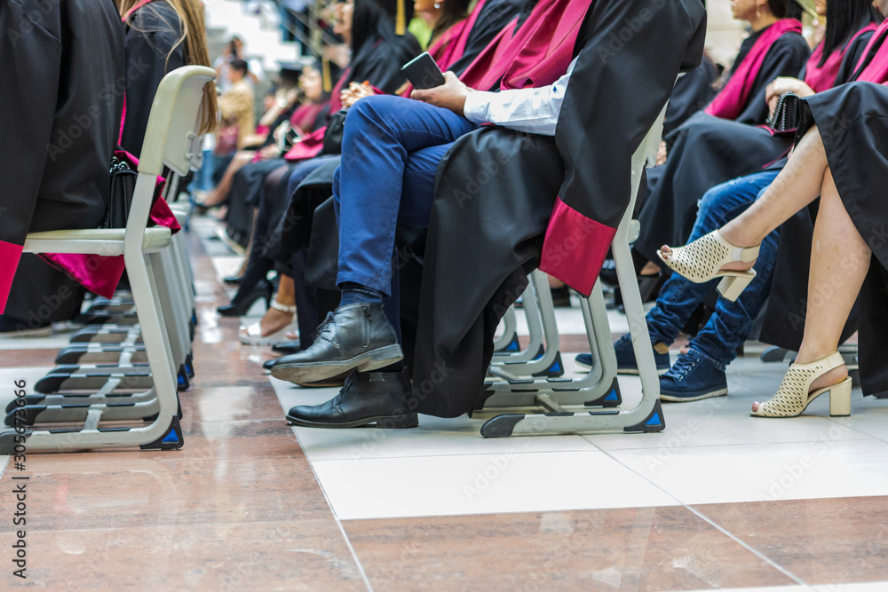 students together in a hall in festive and formal wear. many students dressed in black togas.