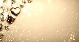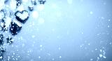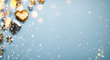 Merry Christmas and Happy Holidays greeting card, frame, banner. New Year. Noel. Christmas white and golden ornaments on blue background top view. Winter xmas holiday theme
