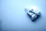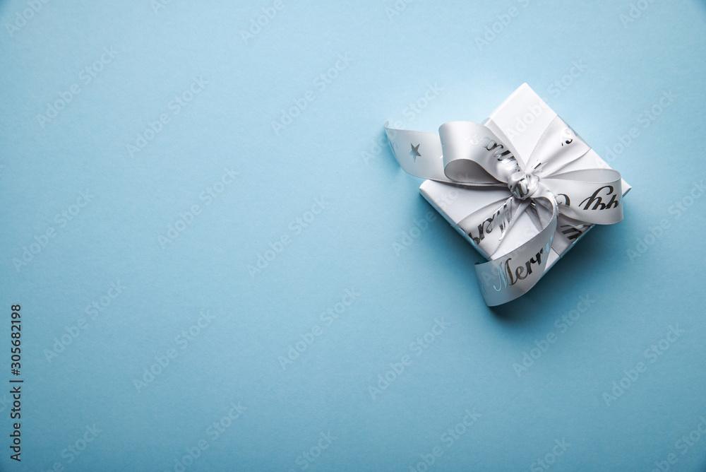 Christmas silver handmade gift box on blue background top view. Merry Christmas greeting card, frame. Winter xmas holiday theme. Happy New Year. Flat lay