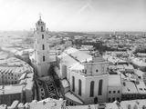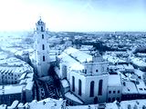 Beautiful Vilnius city panorama in winter with snow covered houses, churches and streets. Winter city scenery in Vilnius, Lithuania.