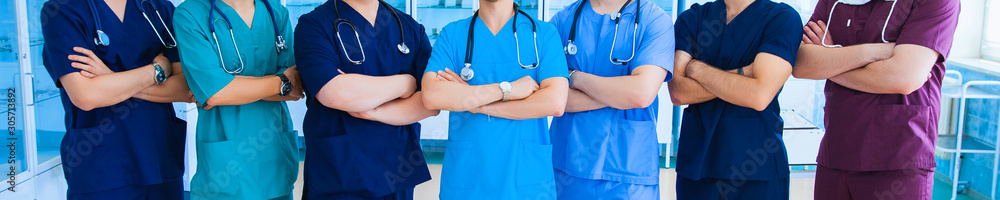 profession medicine staff. multinational people - doctor, nurse and surgeon. a group of faceless doctors. medical advertisement design. background wide promotional banner
