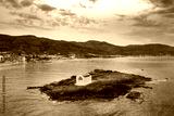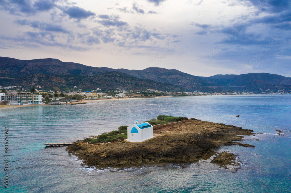 An old white church in a small island at sunset in Malia, Crete, Greece.