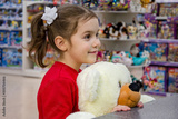 The girl smiles, holding a large polar bear and stands in the store among children's toys. Children's emotions, waiting for gifts and purchases.