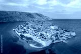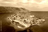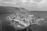 View of the island of Spinalonga with calm sea. Here were isolated lepers, humans with the Hansen's desease, gulf of Elounda, Crete, Greece.