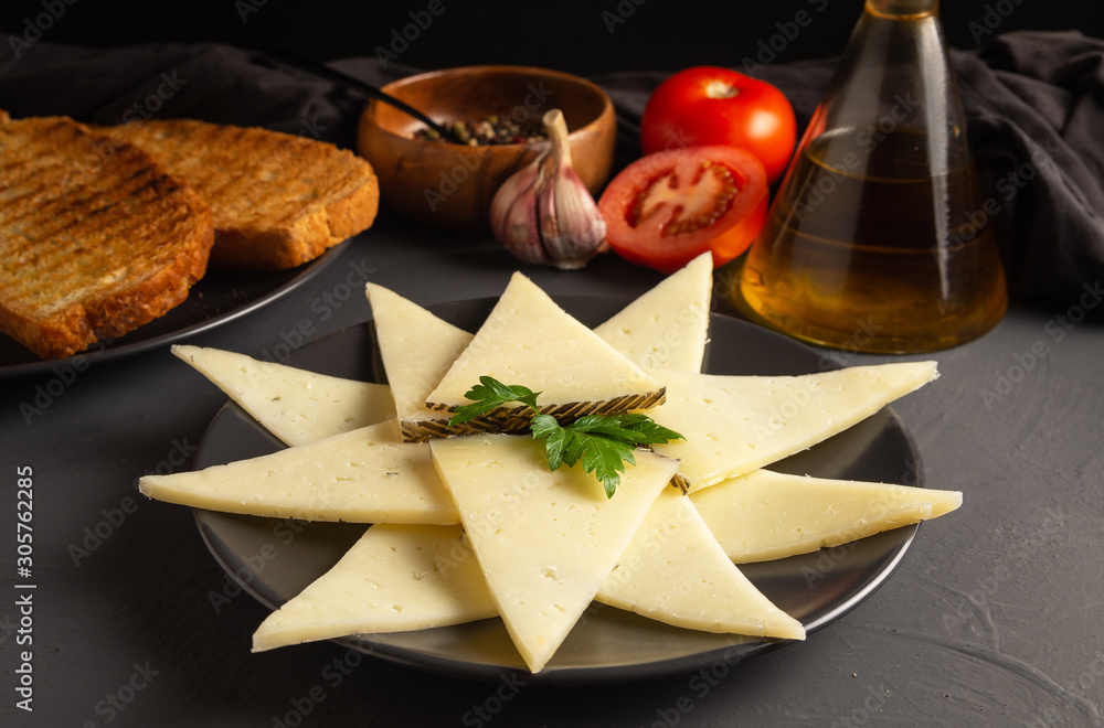 Sliced cheese plate. rustic dark background
