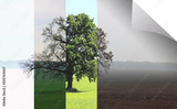 Abstract image of lonely tree in winter without leaves on snow, in spring without leaves on grass, in summer on grass with green foliage and autumn with red-yellow leaves as symbol of four seasons