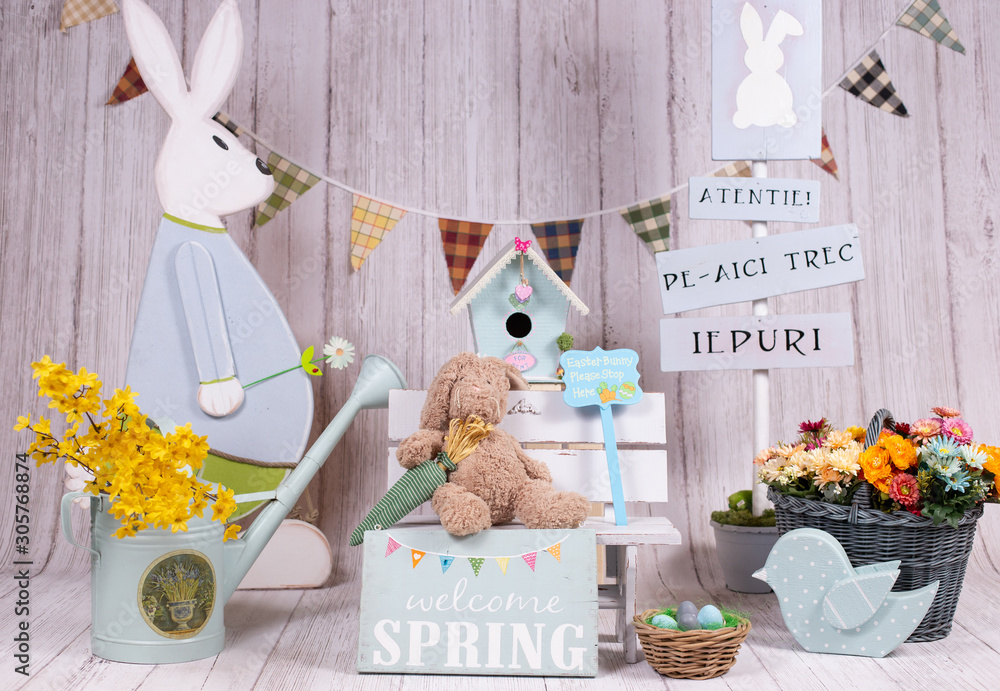 For Easter holidays, colorful backdrops for photo studios, with elements like: eggs, bunnies rabbit, carrots, easter signs, big flowers, giant mushrooms, boxes.