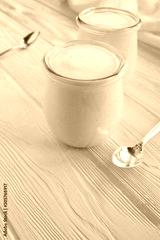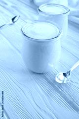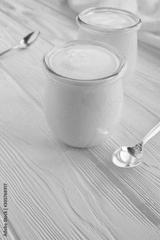 Natural milk yogurt in the glass jars on the white wooden background. Location vertical. Copy space.