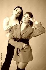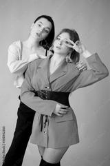 two look fashion girlfriends standing hugging in bright colorful clothes