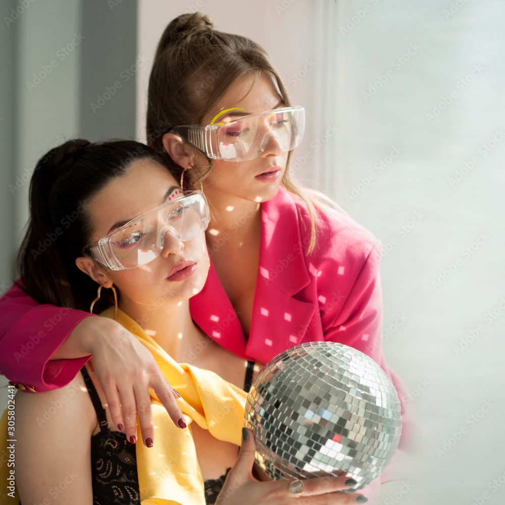 Young womans with bright colorfull spice makeup and Mirror disco ball with shines on shes body near window