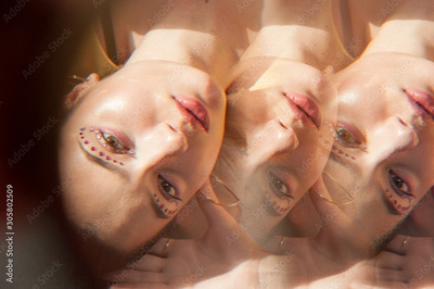 Young beautiful woman with bright colorfull clothess, makeup in kaleidoscope/ Conceptual space photography with art lens.