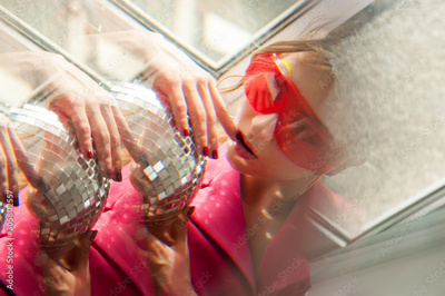 sexy woman with bright glasses, colorfull makeup in kaleidoscope and disco ball. Conceptual color photography. Fashion style