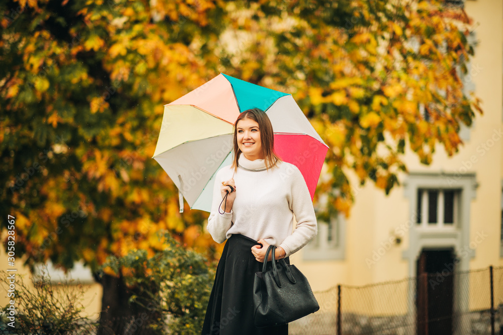 Stylish young woman under the rain, holding colorful umbrella, wearing warm pullover and black skirt