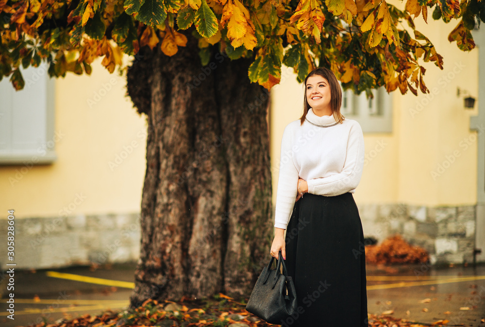 Stylish young woman standing under bright orange yellow chestnut tree, wearing warm pullover and black skirt, holding a bag
