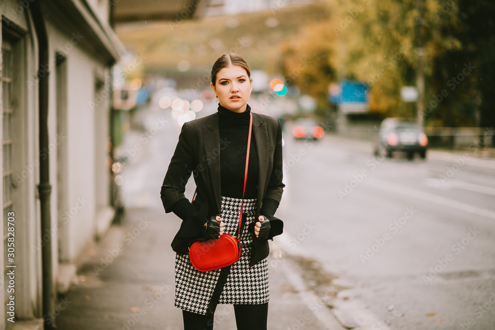 Outdoor fashion portrait of young stylish woman posing on the street by the road, wearing black jacket, check skirt