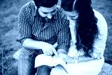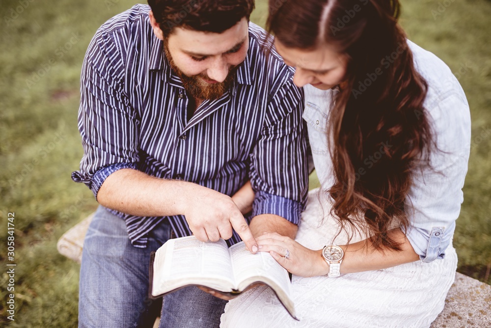 Overhead shot of a couple sitting on a bench and reading the bible with a blurred background