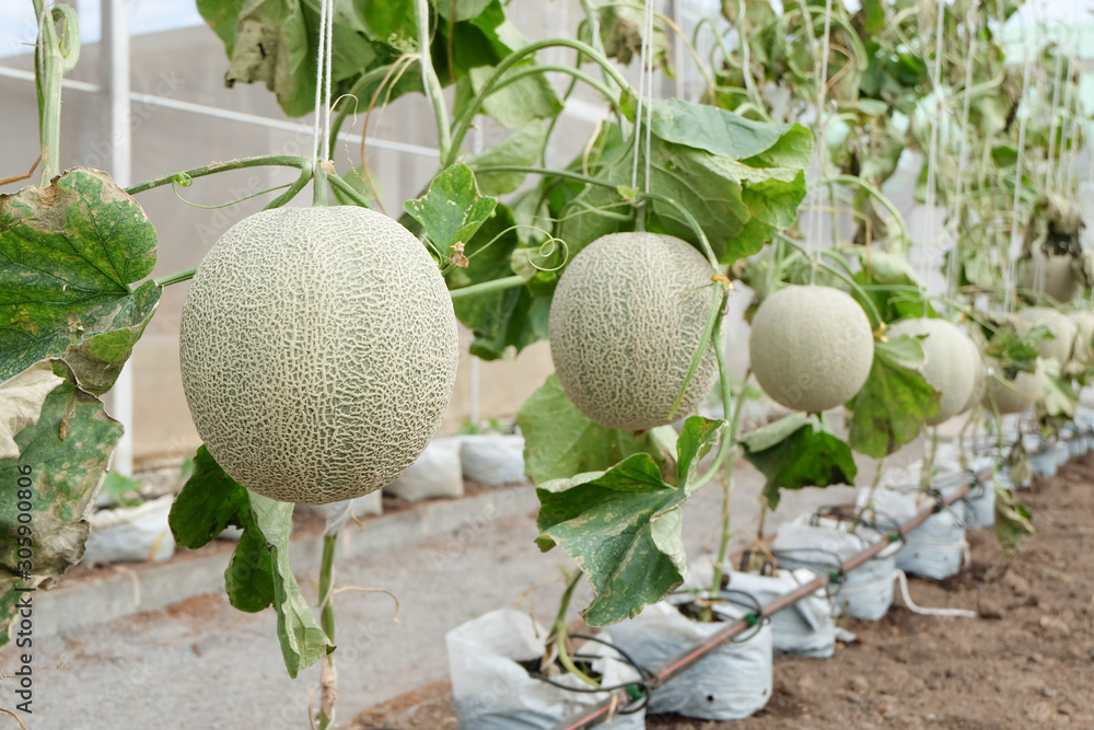 Fresh Melon or Cantaloupe fruit on tree in farm