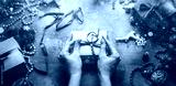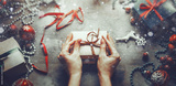 Christmas New Year concept top view. Unrecognizable woman wrapping draws a gift box on wooden table with snow and bokeh, point of view banner