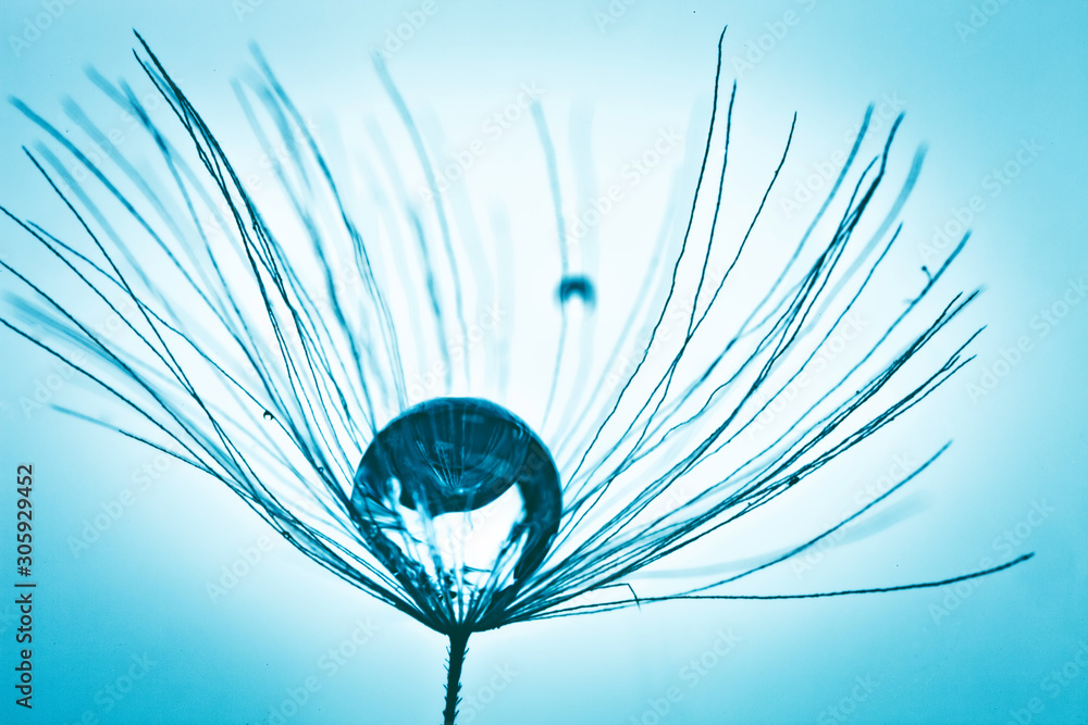 Beautiful dew drops on a dandelion seed. Macro. Beautiful soft light blue and violet background. Selective focus. Background with copy space.
