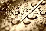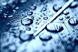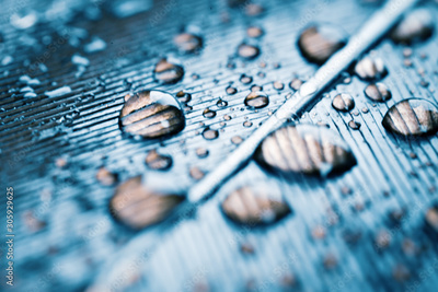 Beautiful water drops on the feather. Macro. Beautiful soft light blue and violet background. Selective focus. Background with copy space.