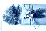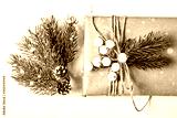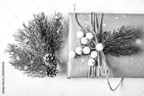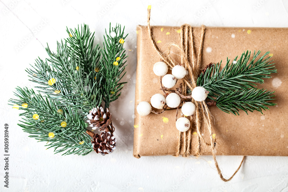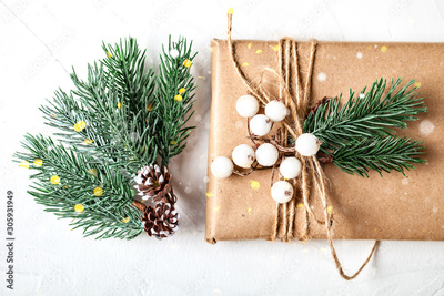 Merry Christmas and happy New year. Mockup with postcard and branches of a Christmas tree on white background.Background with copy space. Selective focus. Top view. Christmas background.