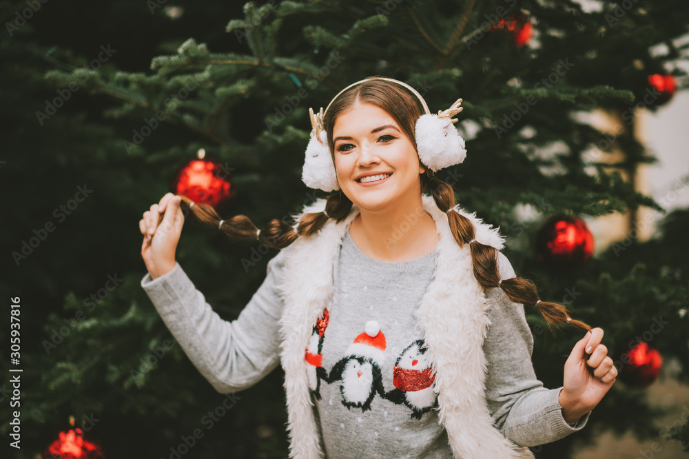 Festive portrait of happy young woman posing outside by the Christmas tree, wearing fluffy earmuffs