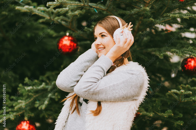 Festive portrait of happy young woman posing outside by the Christmas tree, wearing fluffy earmuffs