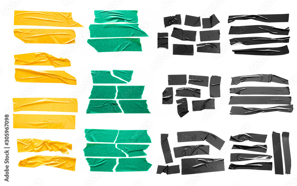 Set of yellow, green, black tapes on white background. Torn horizontal and different size sticky tape, adhesive pieces.