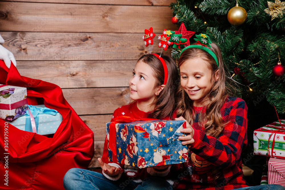Santa Claus giving a present to two little cute sisters near Christmas tree at home