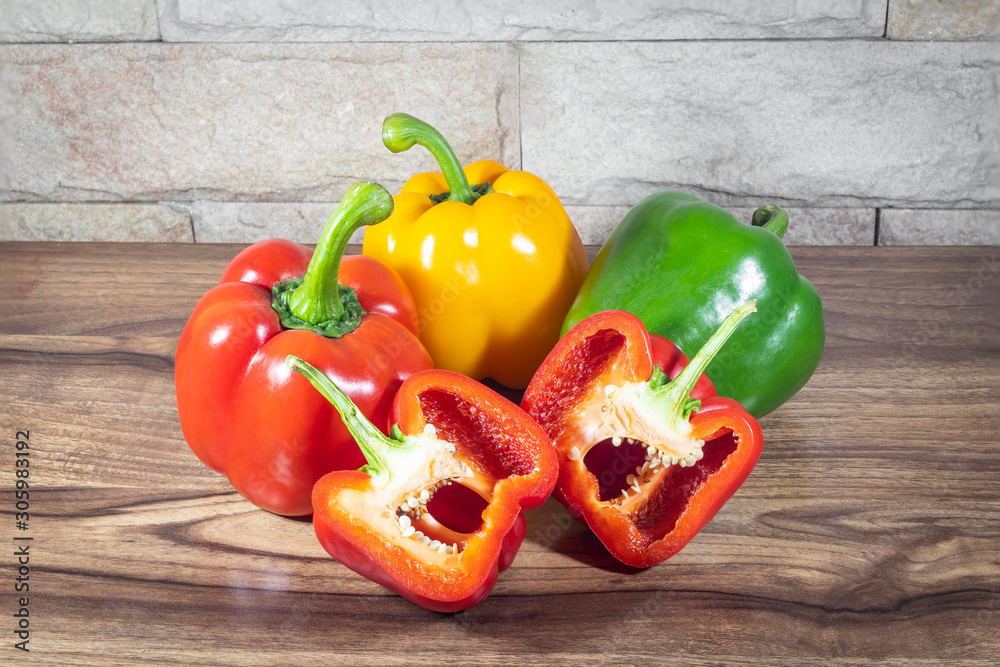 Colorful green,yellow,red bell pepper on wooden table. fresh whole and sliced sweet pepper.