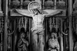 Jesus Christ on the cross in a cathedral or church interior surrounded by ornate stone carvings