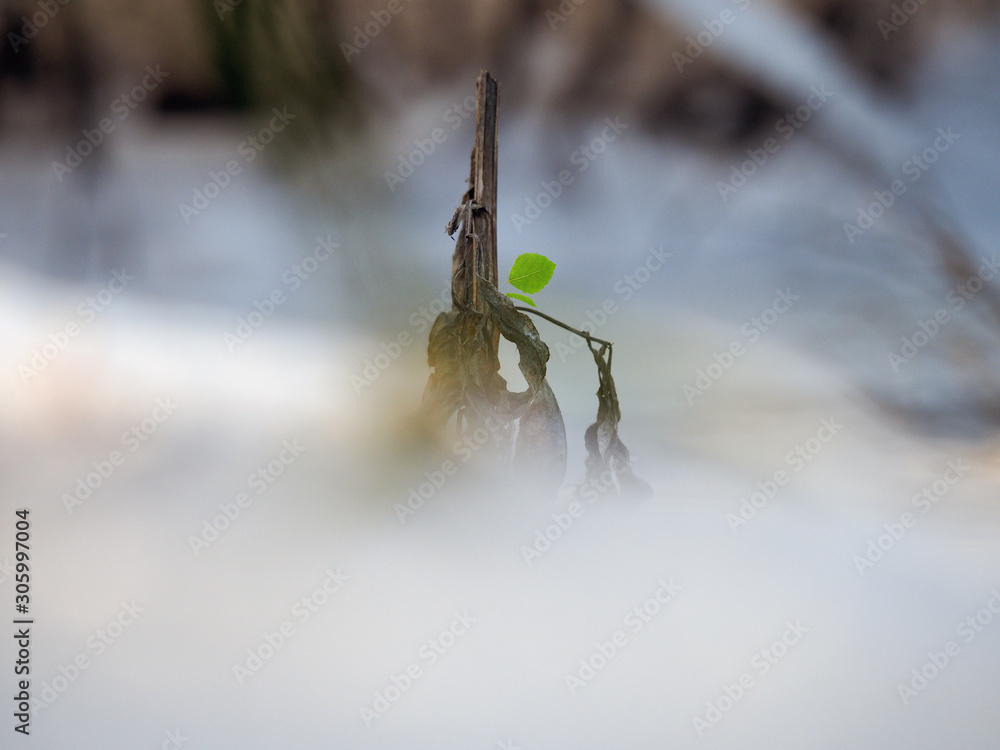 An old dry plant has released green leaves