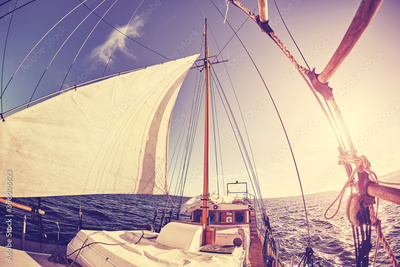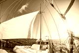 Fisheye lens picture of an old sailing ship at sunset, color toning applied.