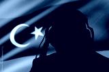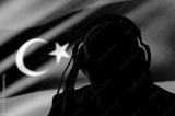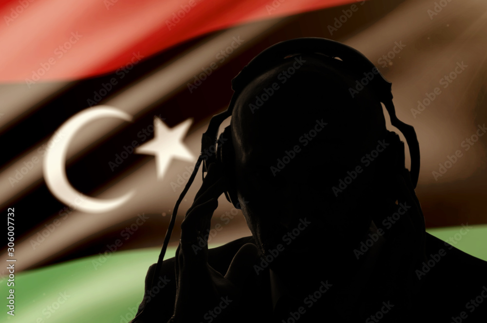 Silhouette of a man wearing headphones on the background of the flag of Libya, eavesdropping on a conversation, secret agent, military intervention, spy and intelligence, backlight