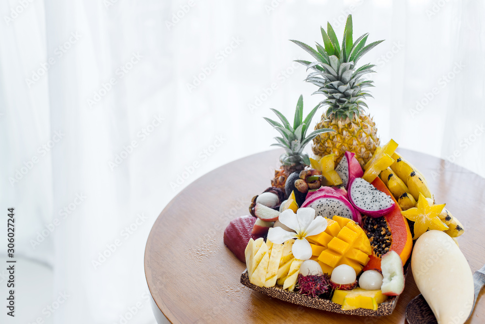 Juicy ripe tropical Thai fruits on a wooden dish.