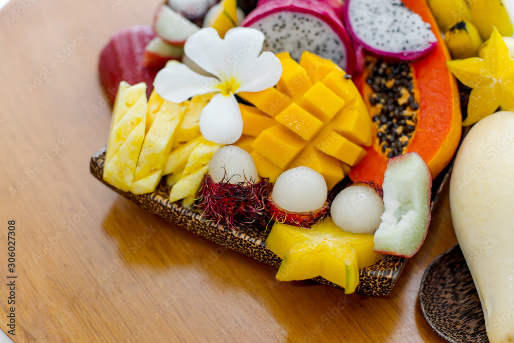 Juicy ripe tropical Thai fruits on a wooden dish.