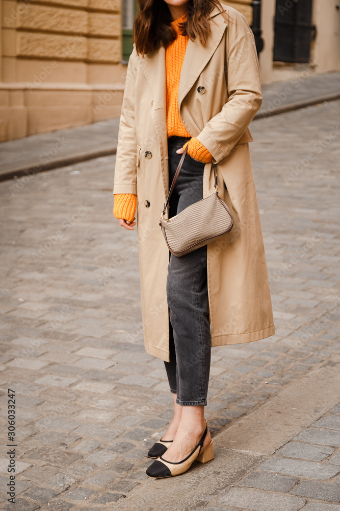 fashion blogger outfit details. fashionable woman wearing beige trench coat, black jeans, slingback ankle shoes and trendy handbag. detail of a perfect fall fashion outfit.